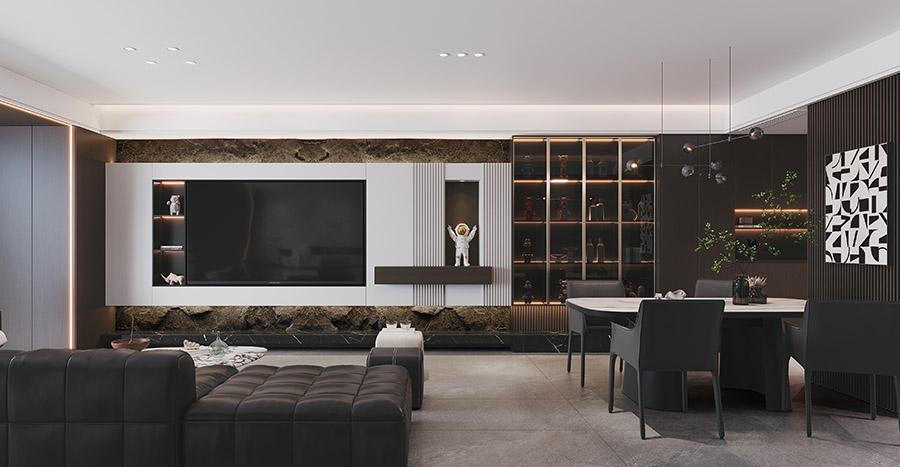 建议客厅开间在3.5米以上的户型,完全可以做这种满墙电视柜!可以设计成二八法则,20%开放格设计,80%有柜门,这样不显乱。在定制电视柜前,还要先熟知自己的生活习惯,提前做好收纳规划,提前想好家里的柜子准备用来收纳什么,这样预留好尺寸和位置,收纳起来更省空间且更合适!