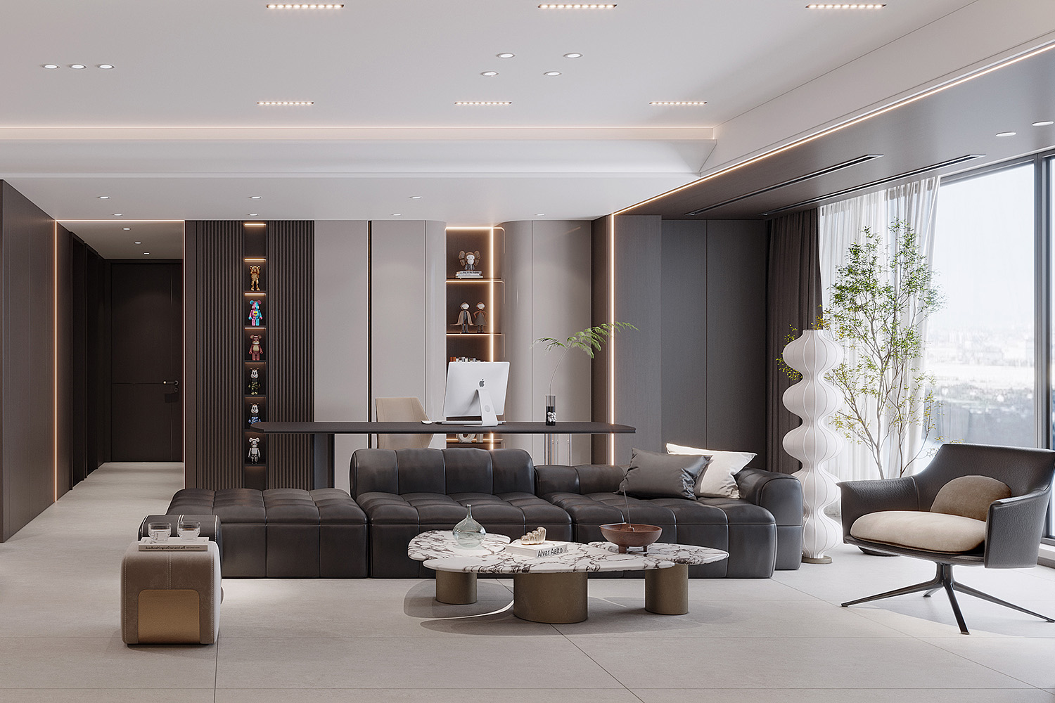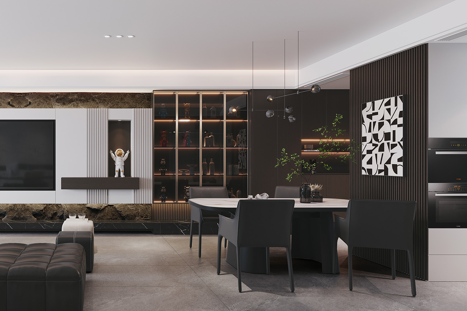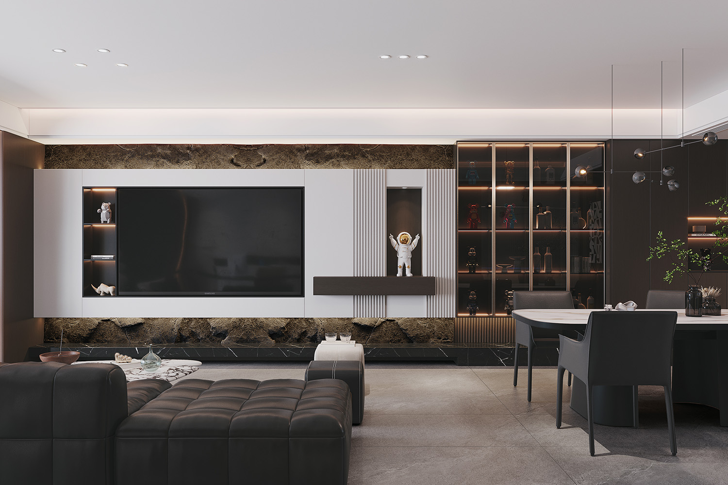 案例简介:本案例业主夫妇对生活充满了热情,偏爱现代简约风的文化,因此在进行家居设计的时候希望设计师能够使用最简约的元素打造出格调感。而在与业主深入交流后,设计师了解到这对夫妻平常最大的兴趣爱好就是读读书,因此在进行空间规划的时候预留了一个专门的书房。同时,整体的装修风格选为现代轻奢风,以满足业主的审美需求。