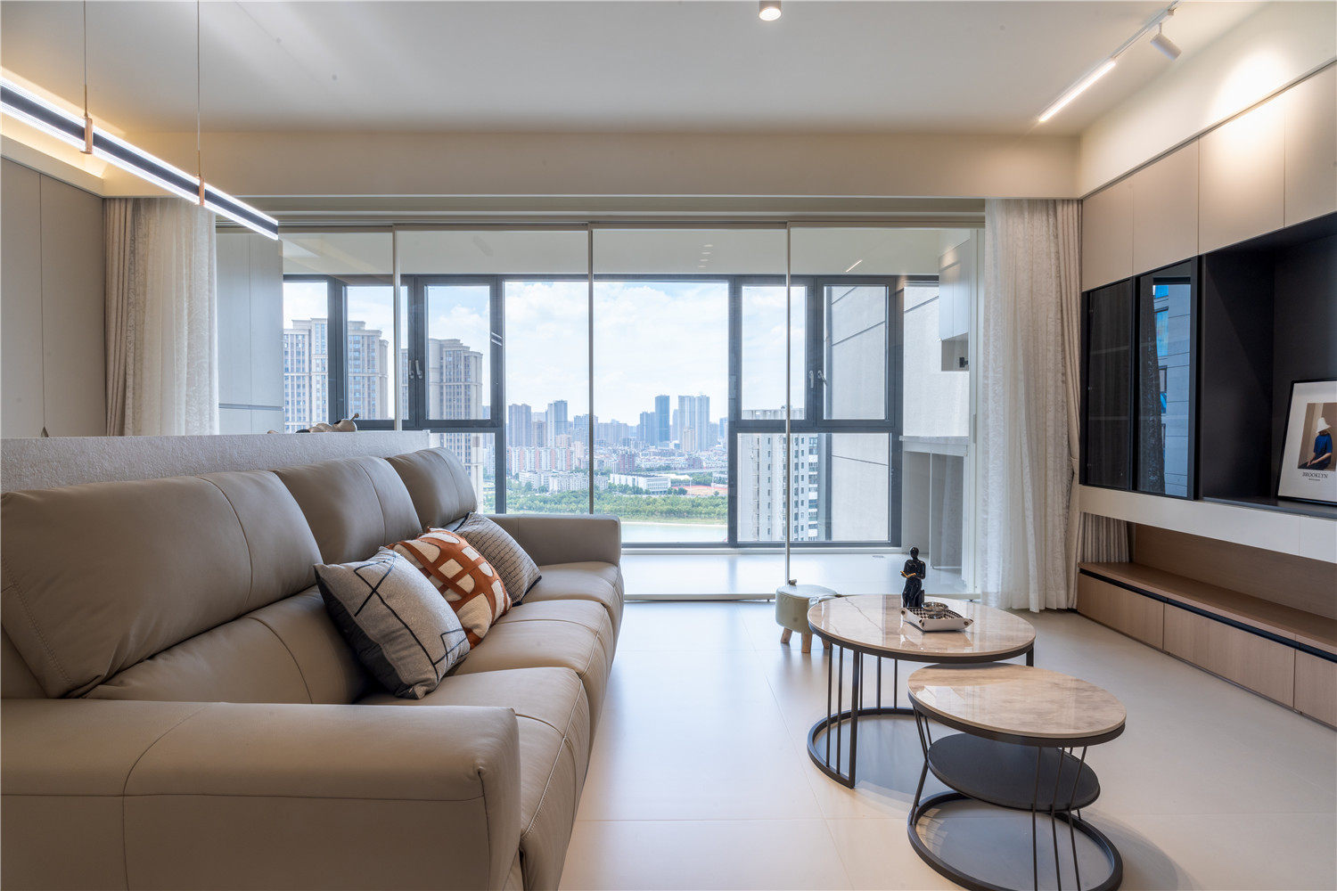 客厅采用新中式天花设计,在线条的勾勒下及中式灯具的点缀下,进一步扩大了客厅的通透感;沙发部分依业主需求,使用了现代白色沙发,搭配木质茶几、电视地柜及新中式软装,令空间显得更加轻盈。