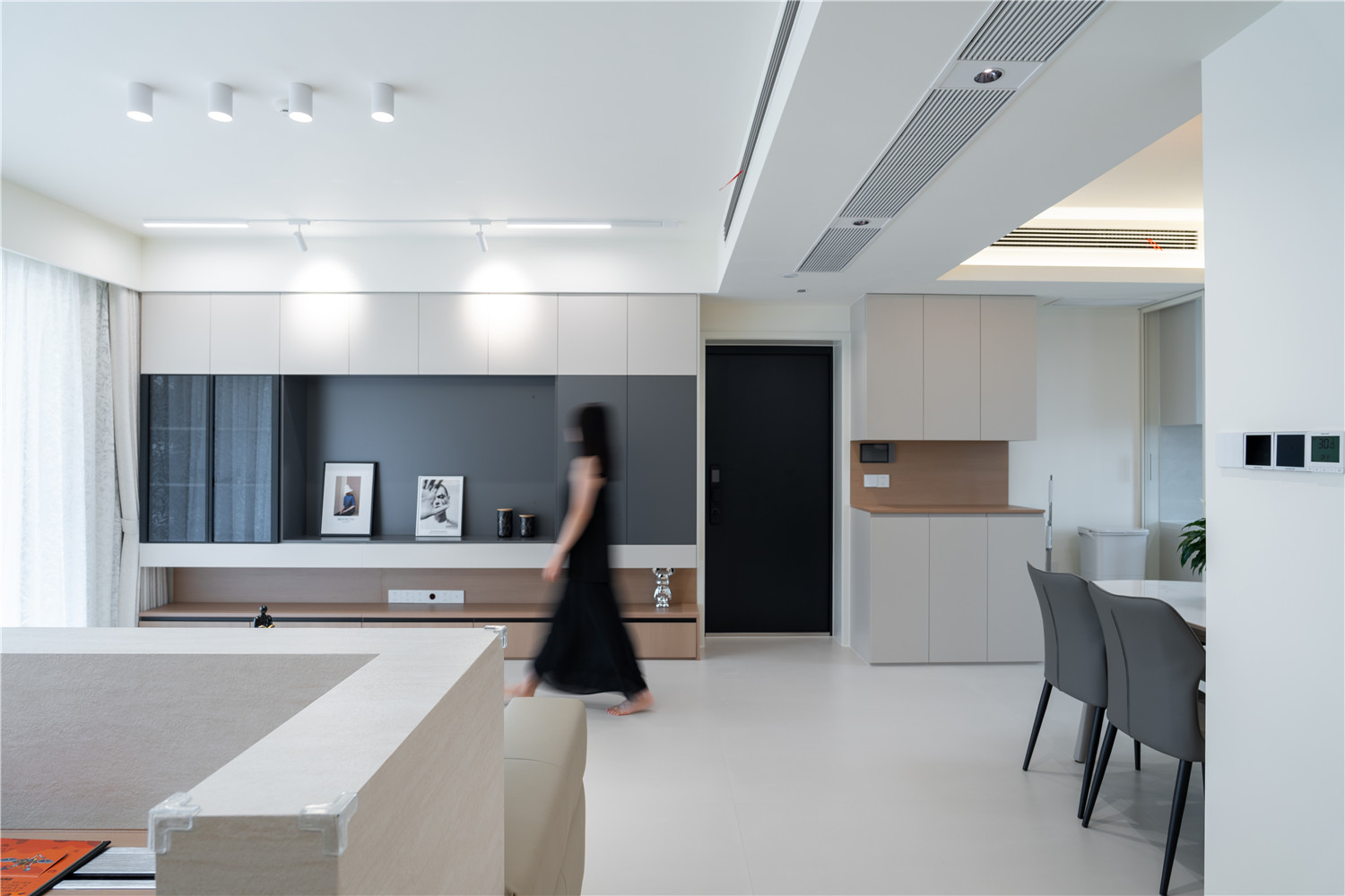 为缓解进门见厅的尴尬局面,玄关处设计了实体半隔断,挂画装饰后观感非常棒;玄关柜采用嵌入式设计,立面干净,为玄关空间赢出更多活动空间。