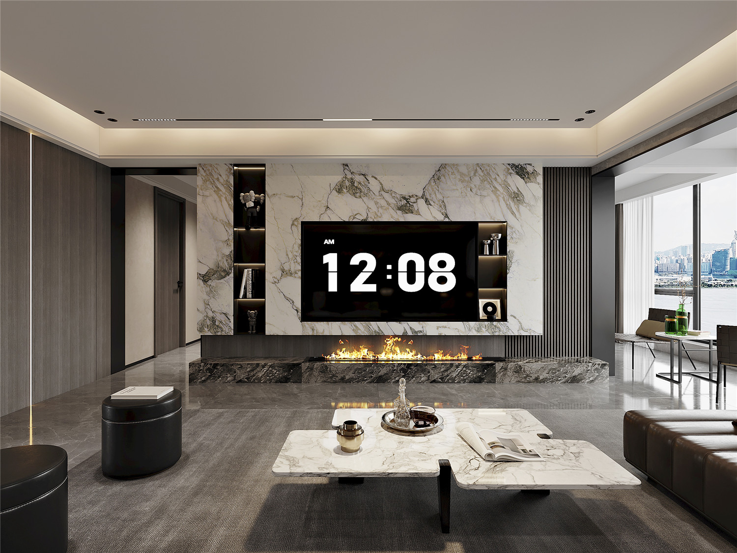 大面积的大理石瓷砖奠定了清冷通透的空间氛围,搭配以质感温润的木材,有效提升了空间的视觉平衡感。