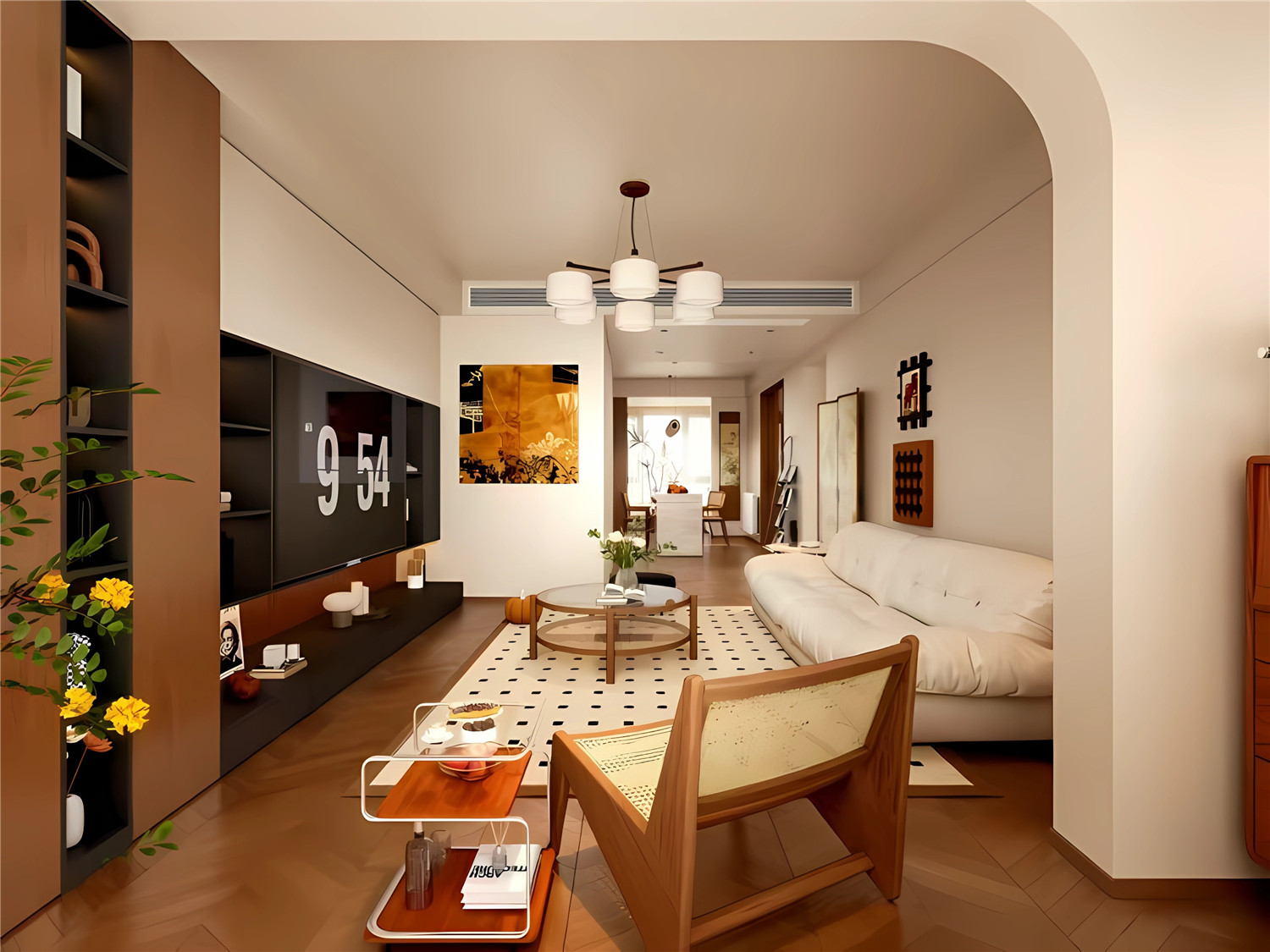 案例简介:本案设计以线色调为主,线性灯点缀面,胡桃木的稳重色调进行搭配。沙发、灯具及软装的陈设,充分展现通透空间的所派感。以纵向穿插呈现空间的力度之美,展示美学点、线、面的特点之美,模糊空间界线、材质界线,造就层次流转的界面语汇,尽显空间魅力。作为新人的婚房而言,完全符合了现代人的审美需要。