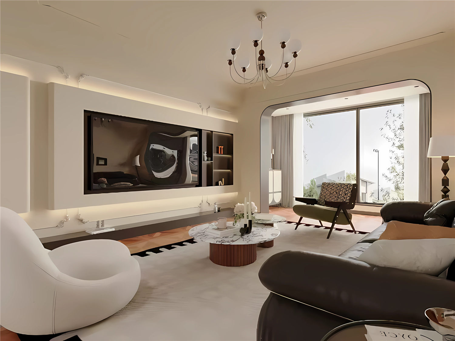 独特线条的背景墙和现代的家具搭配很时尚,浅色调的客厅温馨舒适。