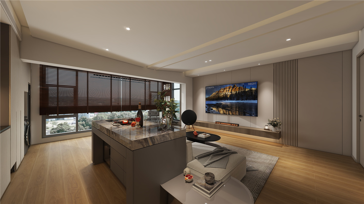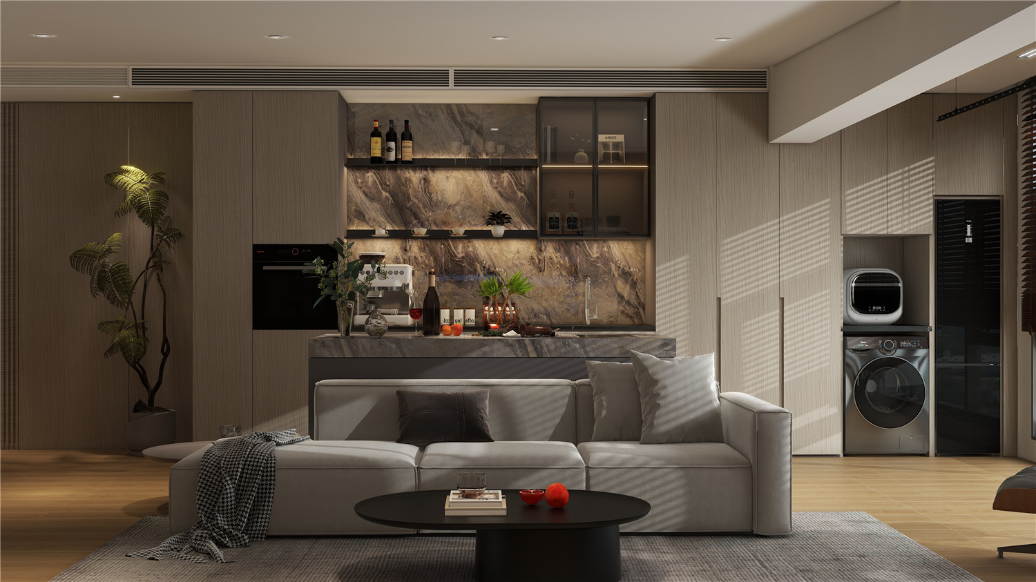可以区域借助大理石大面打造结构感,并利用高低差满足日常坐卧需求,现代时尚感浓烈。