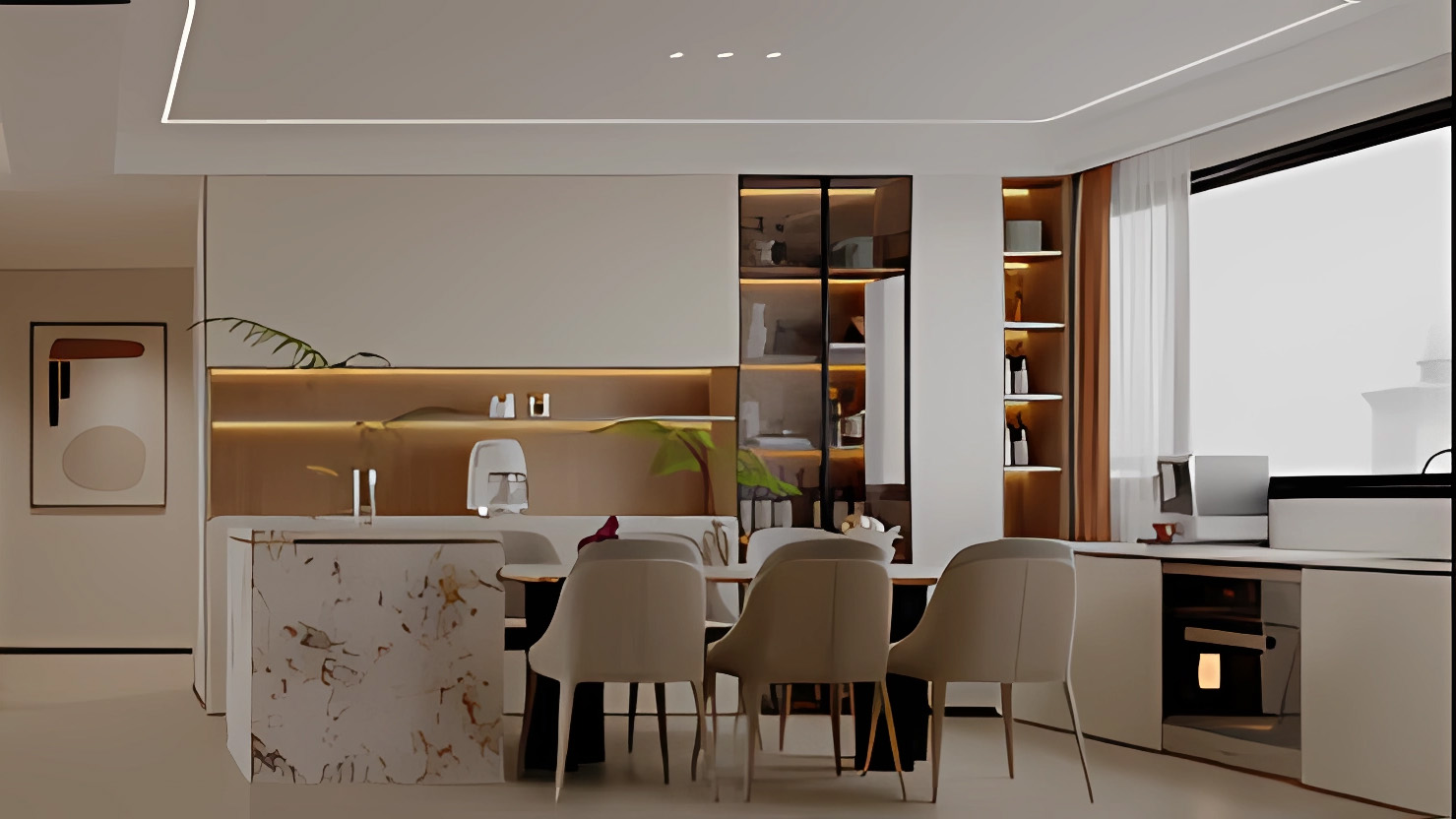 2    餐厅餐桌靠墙摆放,家居动线合理开阔,餐边酒柜美观实用。