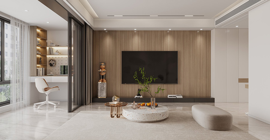 木质地板搭配上几个可收纳式的毯子就构成了多功能区,强调自由随意感。