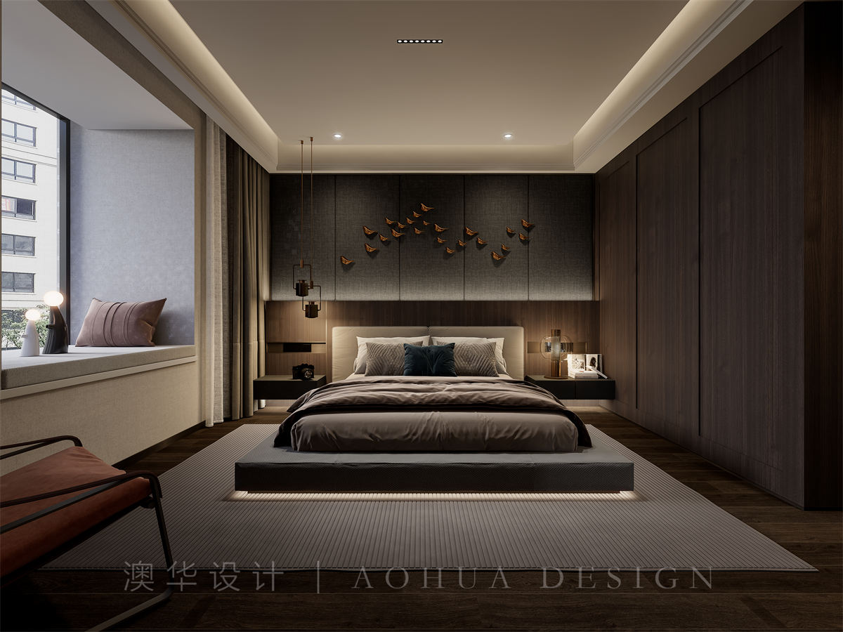 • 根据客户的想法进行深化设计,按照客户的喜好做了深色层次的设计,整个卧室优雅整洁。