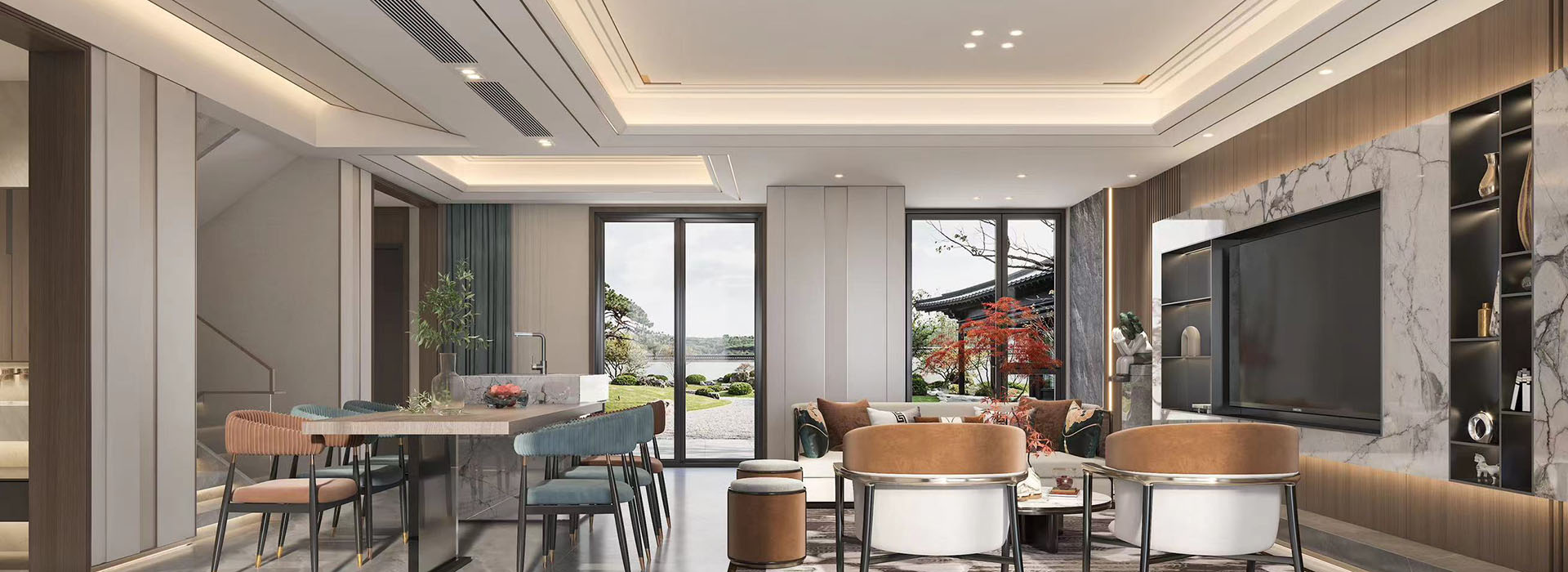 客餐厅、厨房、休闲与生活阳台一站式连体规划,饰以每个区域不同的天花造型,让整体空间达到横向阔远,纵向拔高的视觉冲击感。