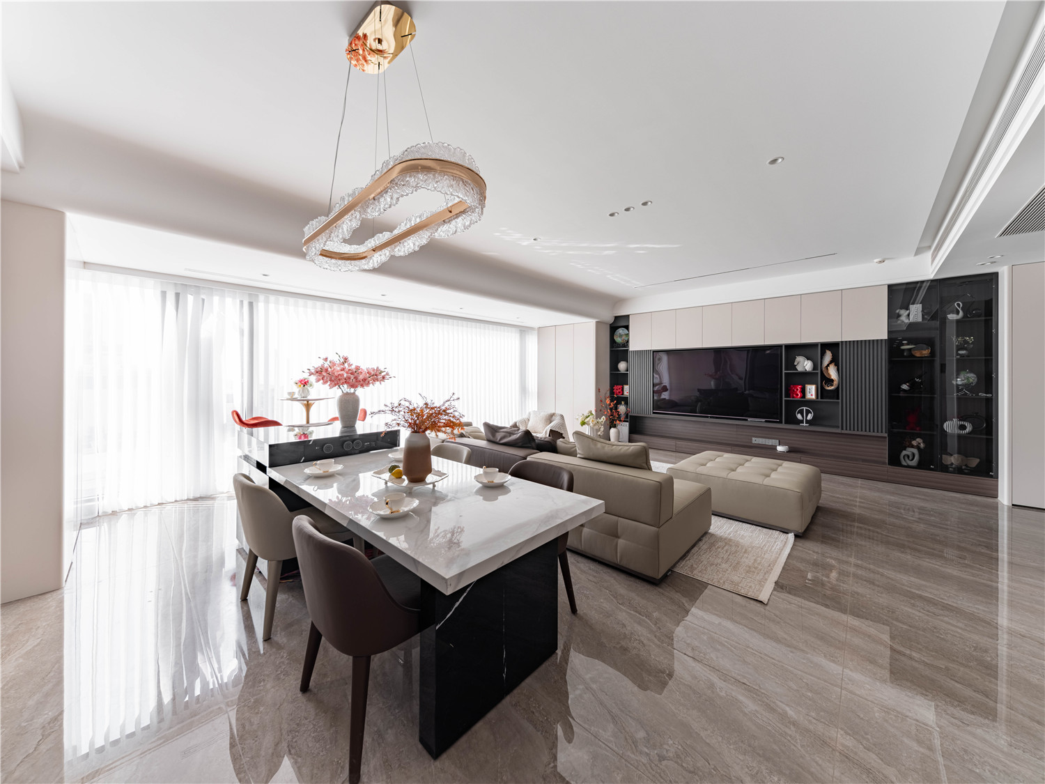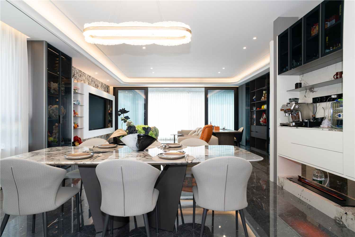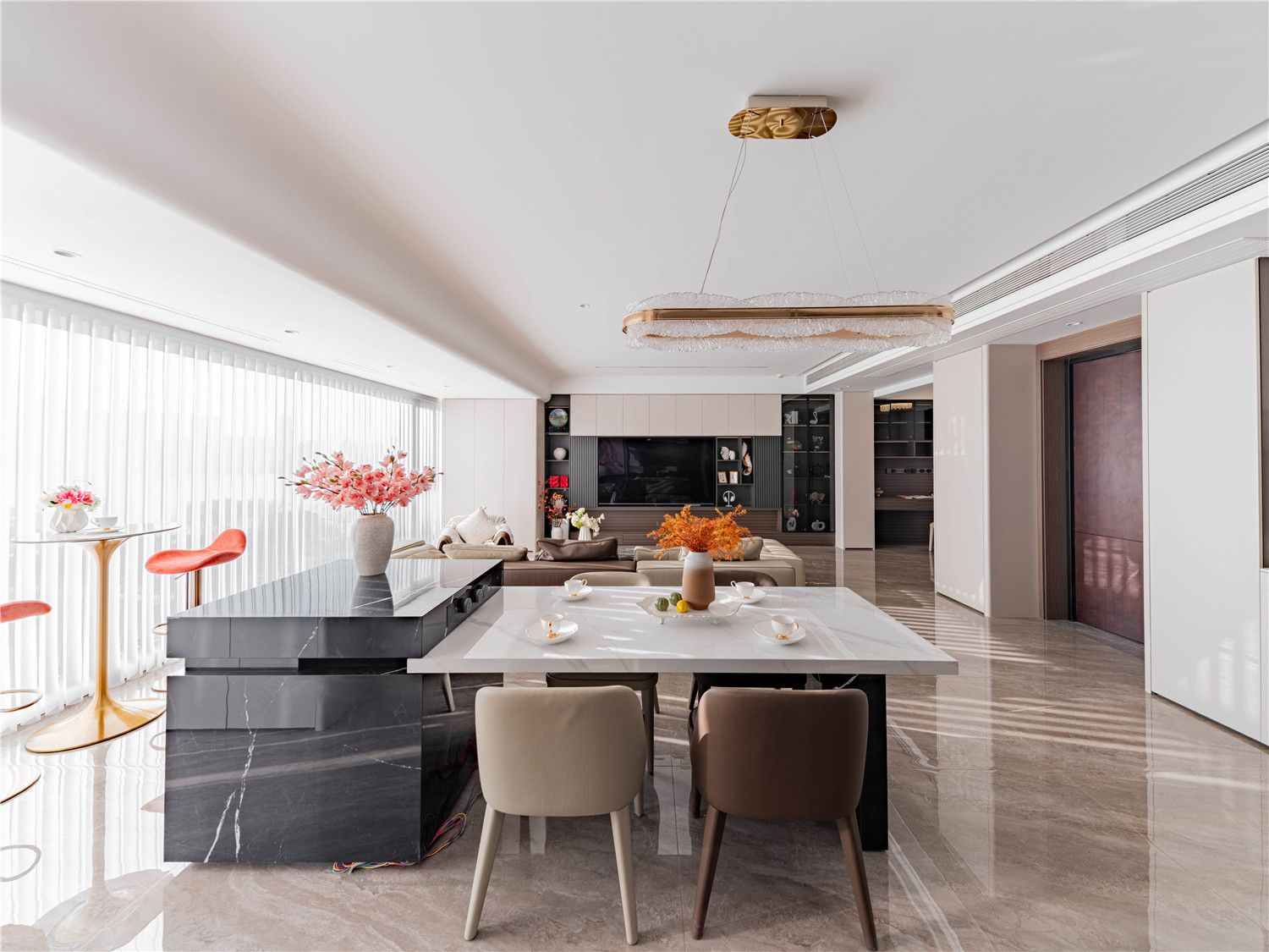 深灰色的暗纹大理石地板搭配上设计感十足的几何灯饰,现代时尚气息显露无疑。大面积的落地窗为就餐区域增添了明亮大气美。灰色与亮橘色搭配的餐椅,则为整个空间注入了一抹清新的律动美。