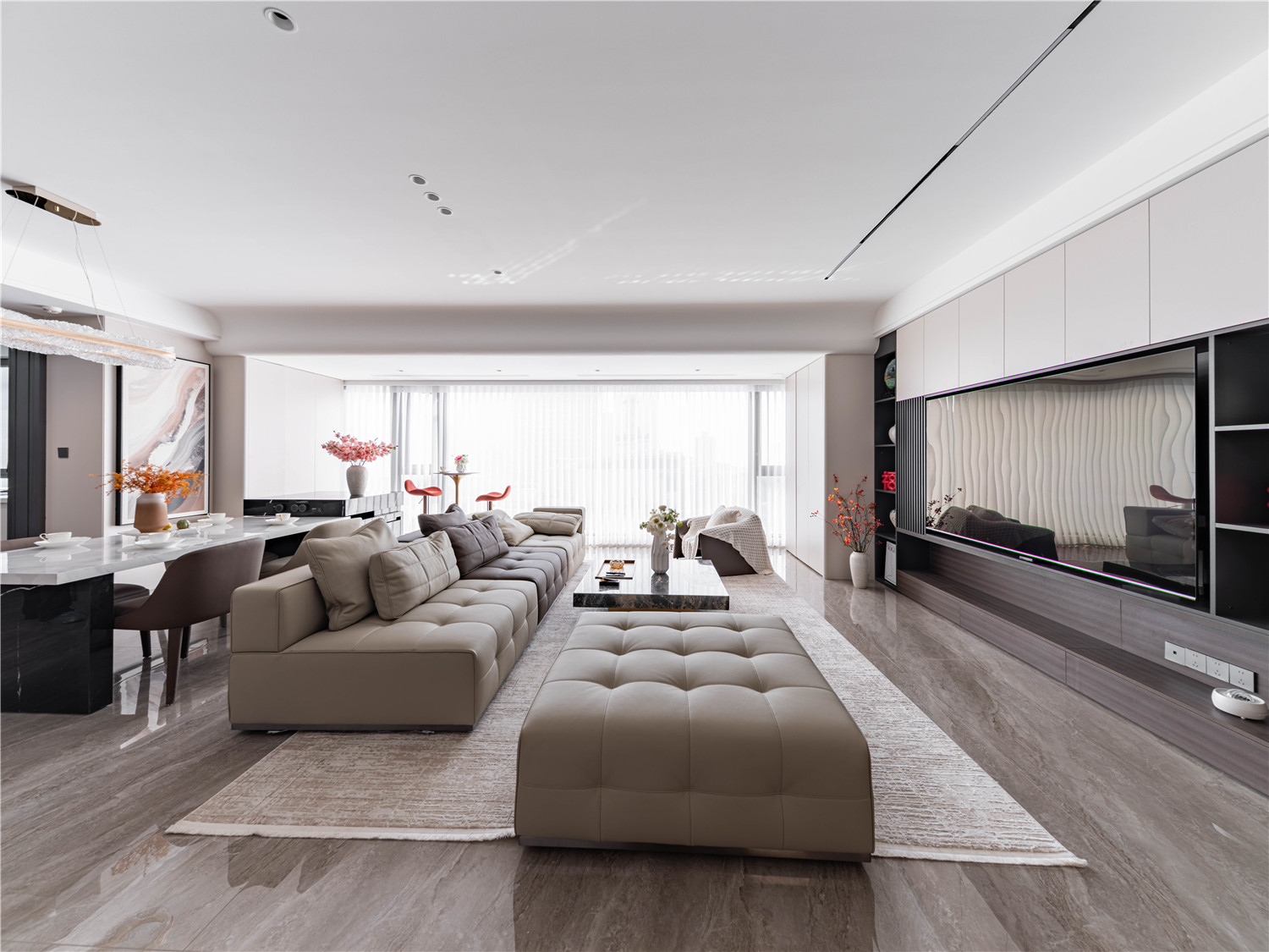 大面积的白色搭配上原木色,强调简约格调之美;大面积的暗纹大理石背景墙低调而又不失典雅气息,搭配上柔软的灰色沙发,轻奢之感呼之欲出。二层客厅处则使用了黑色围栏,将一层空间与二层空间明显隔断开来,而又不显得突兀。