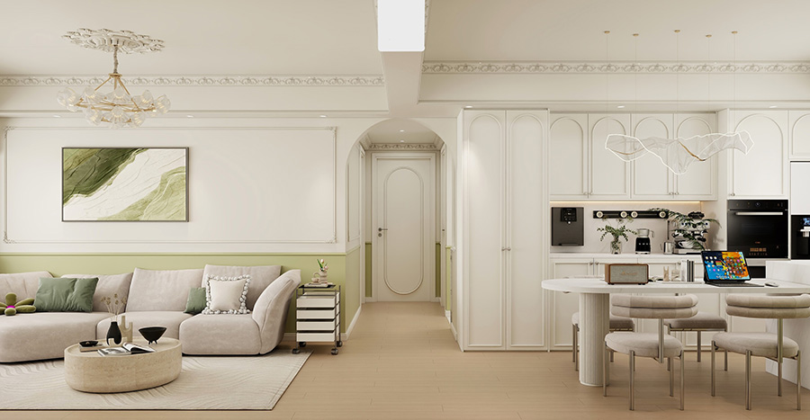 金地自在城这套136㎡的四居室住宅虽然建筑面积不小,但是由于空间中独立的空间比较多,因此各个功能区域的占地面积其实并不大,因此设计师在对空间进行规划设计的时候就需要优先考虑从视觉上起到扩大空间的作用,避免造成视觉压迫感,进而影响起居质量。而双阳台设计,则在保障南北通透的情况下有效提升了室内的视觉宽敞度。