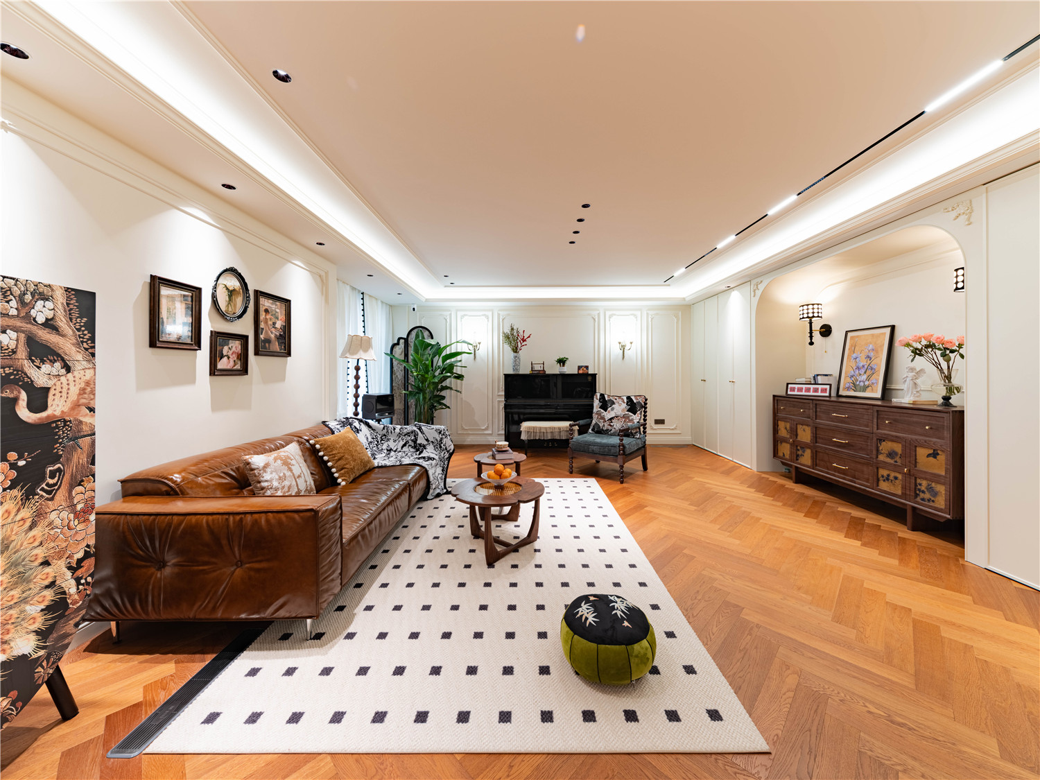 这是一所坐落在梦湖香郡的267平方米复式大别院,空间户型方正、南北通透且采光好,因此设计师在进行设计的时候将空间户型优势发挥到极致,利用大面积的落地窗设计让室内空间看起来更加明亮洁净。为满足业主的审美需求,空间整体使用了较多深色元素,以营造一种沉稳氛围,再搭配以欧式风情元素,强调典雅复古魅力。