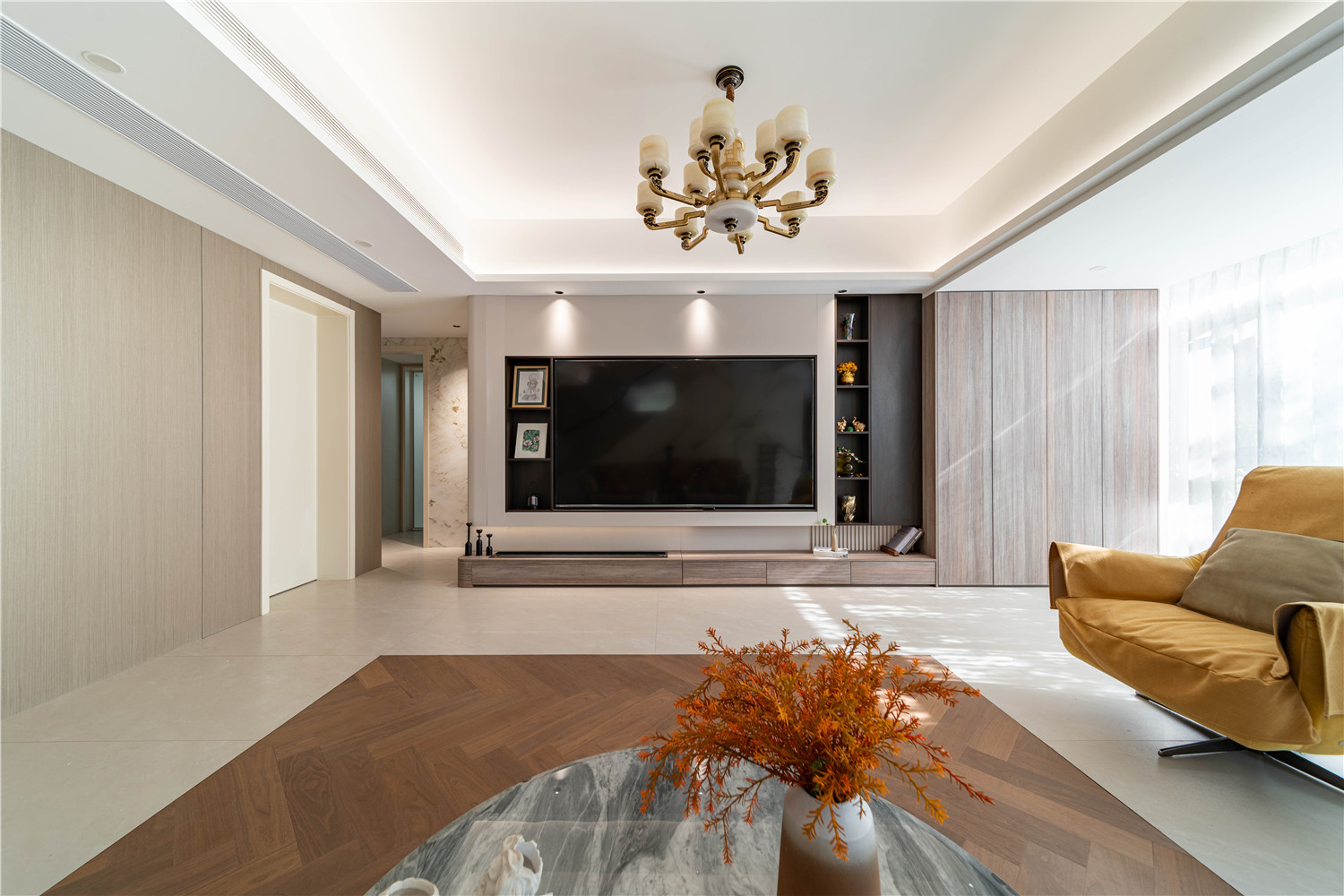 带有灰色暗纹处理的大理石墙壁简约而又不失高级感,在无形中提升家居品质感。