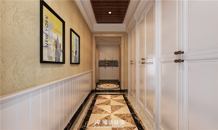该户型的玄关属于长条形结构,且相对比较狭窄,所以设计师并没有在该区域做过多的装饰设计,而是利用暖黄色作为主基调色,强调空间的欧式风情,同时借助两幅简约的欧式挂画进行点缀,以提升空间丰富感。