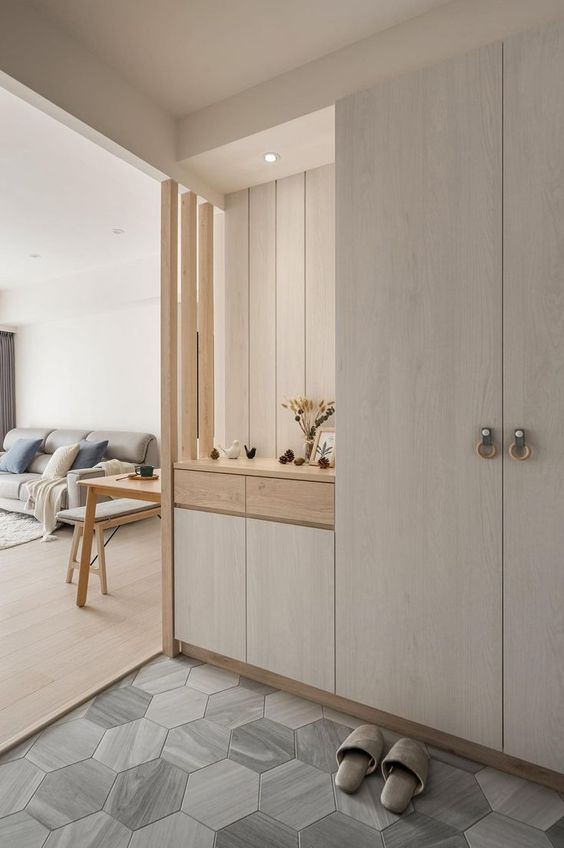 ②用不同材质做区分:做不到标准的下沉式设计,我们可以通过不同材质的拼接,让室内外做出1-5cm左右的高度差,最常见的有玄关铺瓷砖+室内木地板。