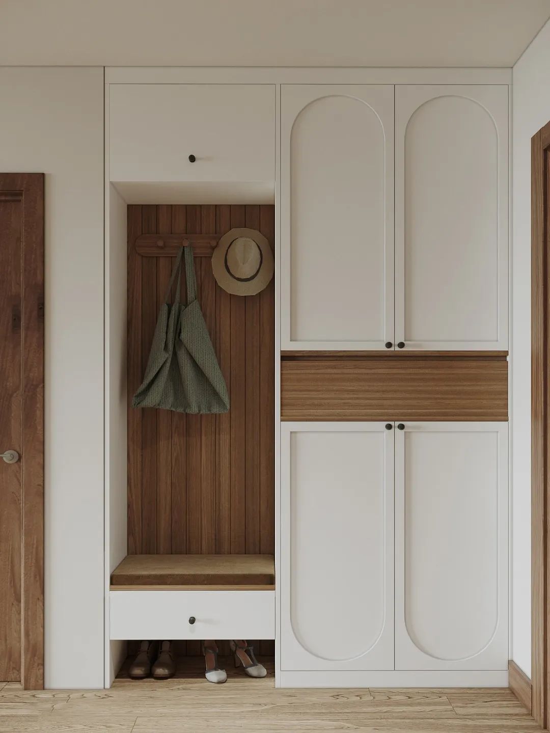 ⑥增设换鞋凳:直接将换鞋凳设计在挂衣区下方,节省空间又简洁美观;也可以直接选择成品换鞋凳,注意尽量选轻巧灵便的款式,需要预留可以摆放的位置。