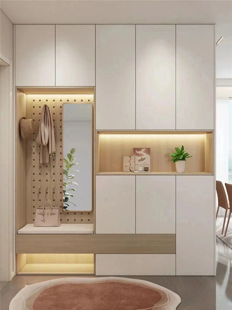 入户玄关柜一般被用作鞋柜和衣物收纳,当然,如果有空白墙面或玄关空间足够,可以设计柜体+换鞋凳一体,或者规划出挂衣区。