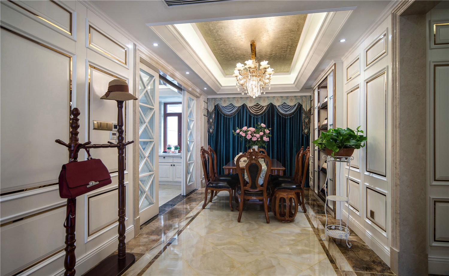 端景柜上的鲜花绿植,在内置灯带、射灯等光线的烘托下,营造出尊贵、典雅的艺术氛围。