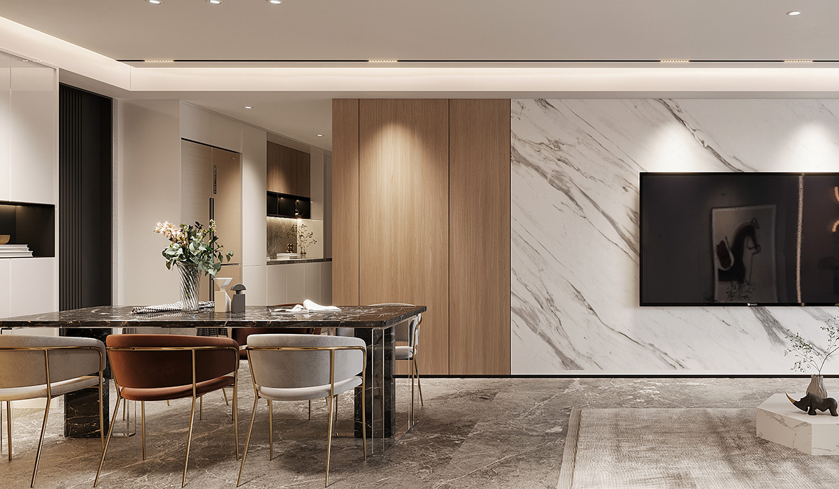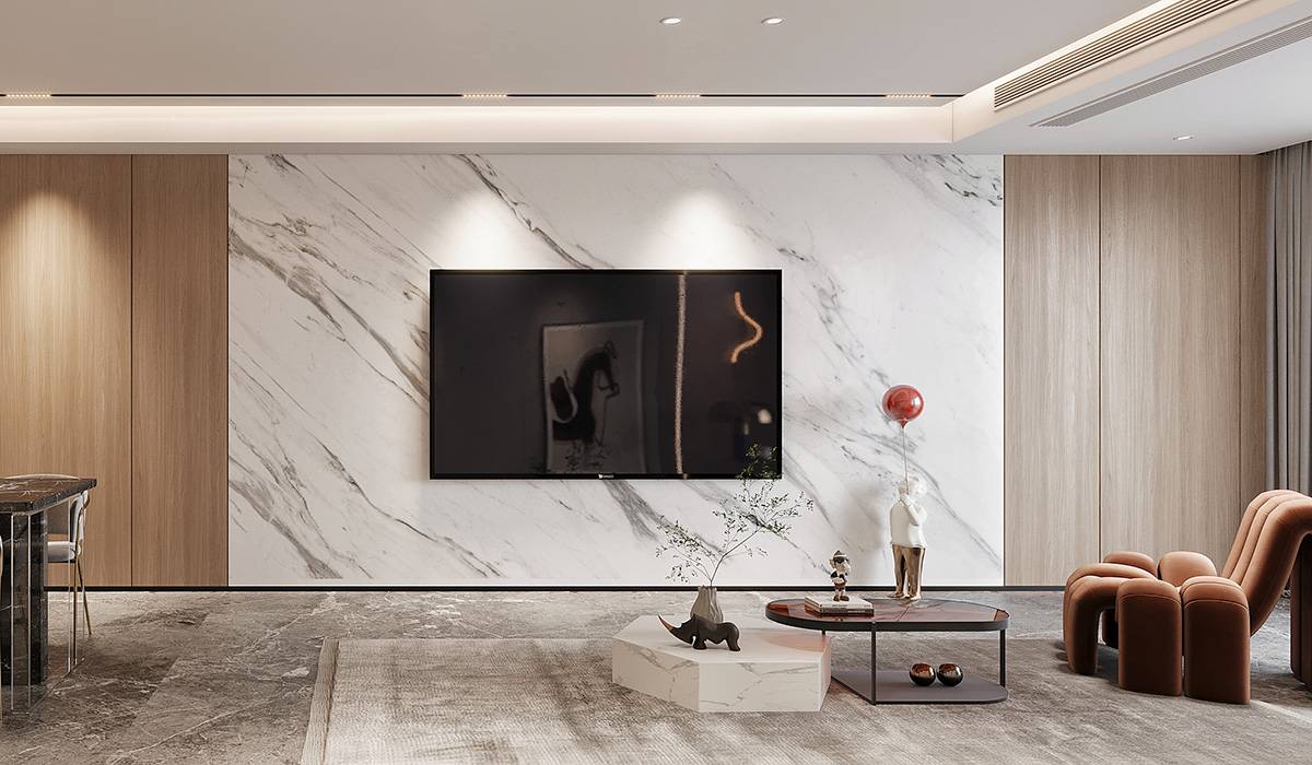 由天地壁三个面向来陈述运用垂直水平几何线条电视墙,机能整合与建筑概念的导入掌握空间的特质与需求