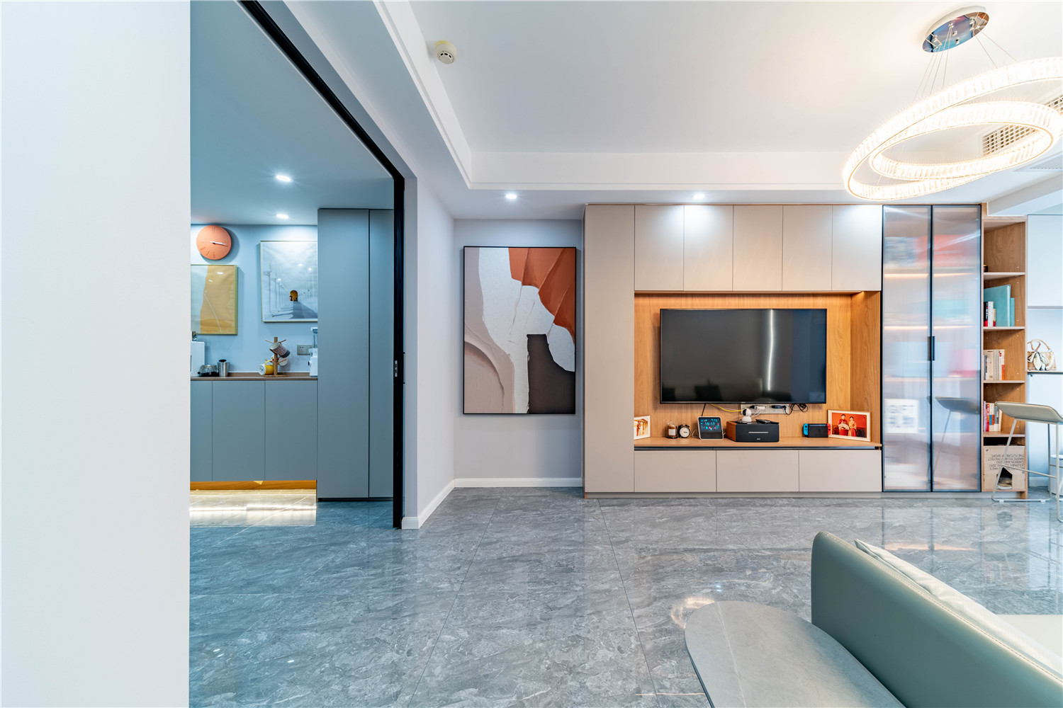 客厅强调色彩与线条的简洁,大面积纯色铺陈,奠定简约、干净的空间基调。射灯与水晶吊灯营造氛围,嵌入柜体的灯带渲染主体,光影演绎瞬间让人心动。