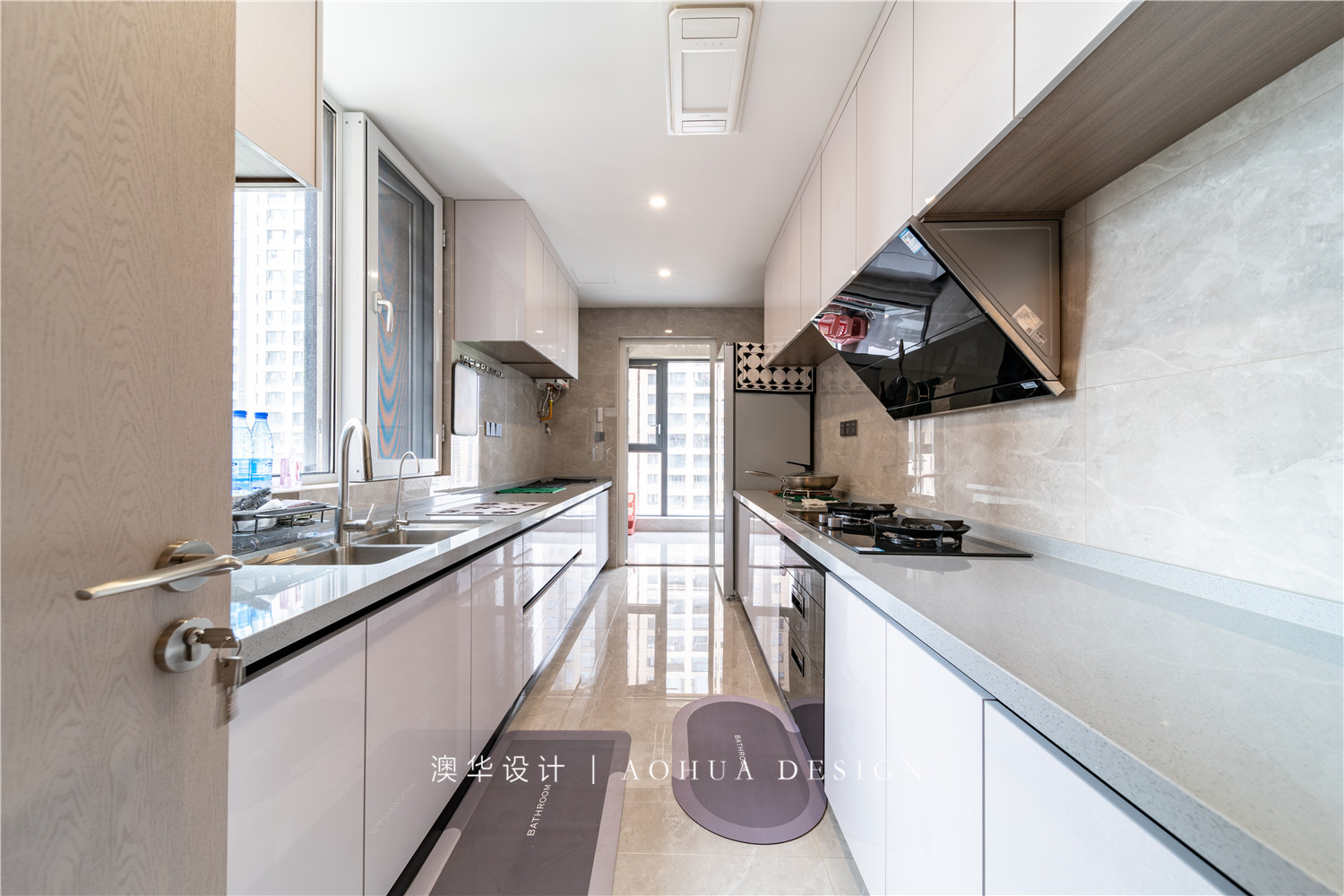 厨房与阳台打通,带来绝佳的采光与通风效果。整体配色素雅浅淡,呈现简洁干净的高级感。