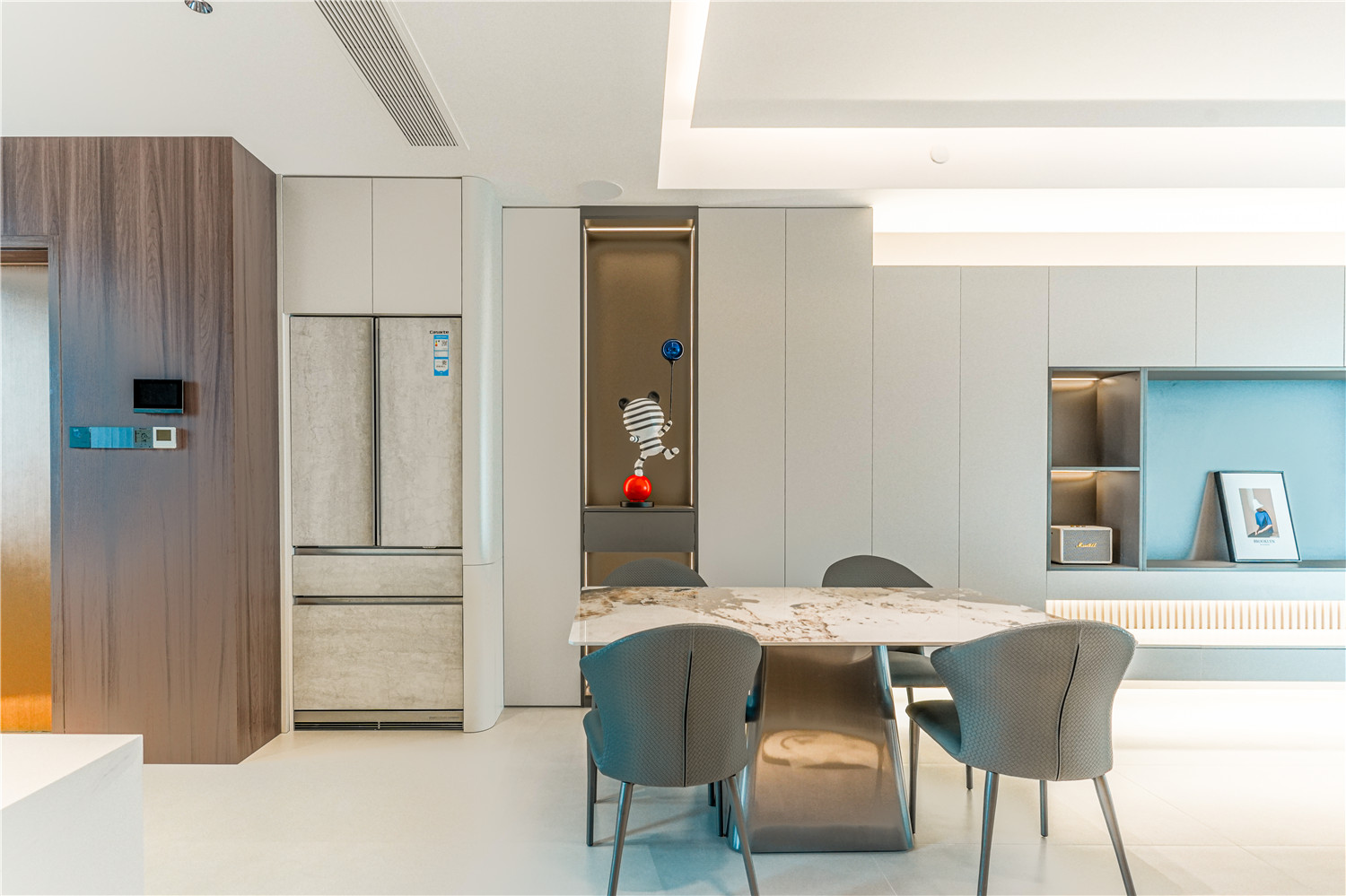 餐厅与客厅相连,延伸至餐厅的电视墙柜将冰箱完美嵌入,柜体边缘采用弧形设计,柔化了空间的棱角,过渡自然,也相应减少了安全隐患。