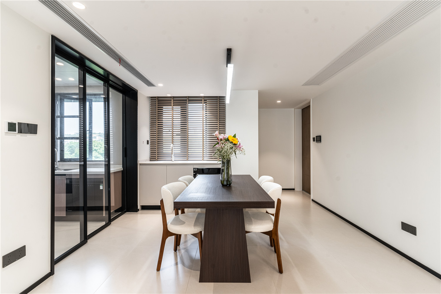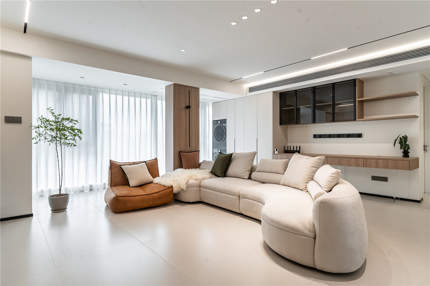 大面积落地窗尽情接纳自然光线的温柔拥抱,光影浮动间,隔绝了室外的喧嚣;整体色调以暖白色与暖木色为主,间或穿插着植物盎然的绿意,呼吸都随之轻盈,多了几分随意与空灵。