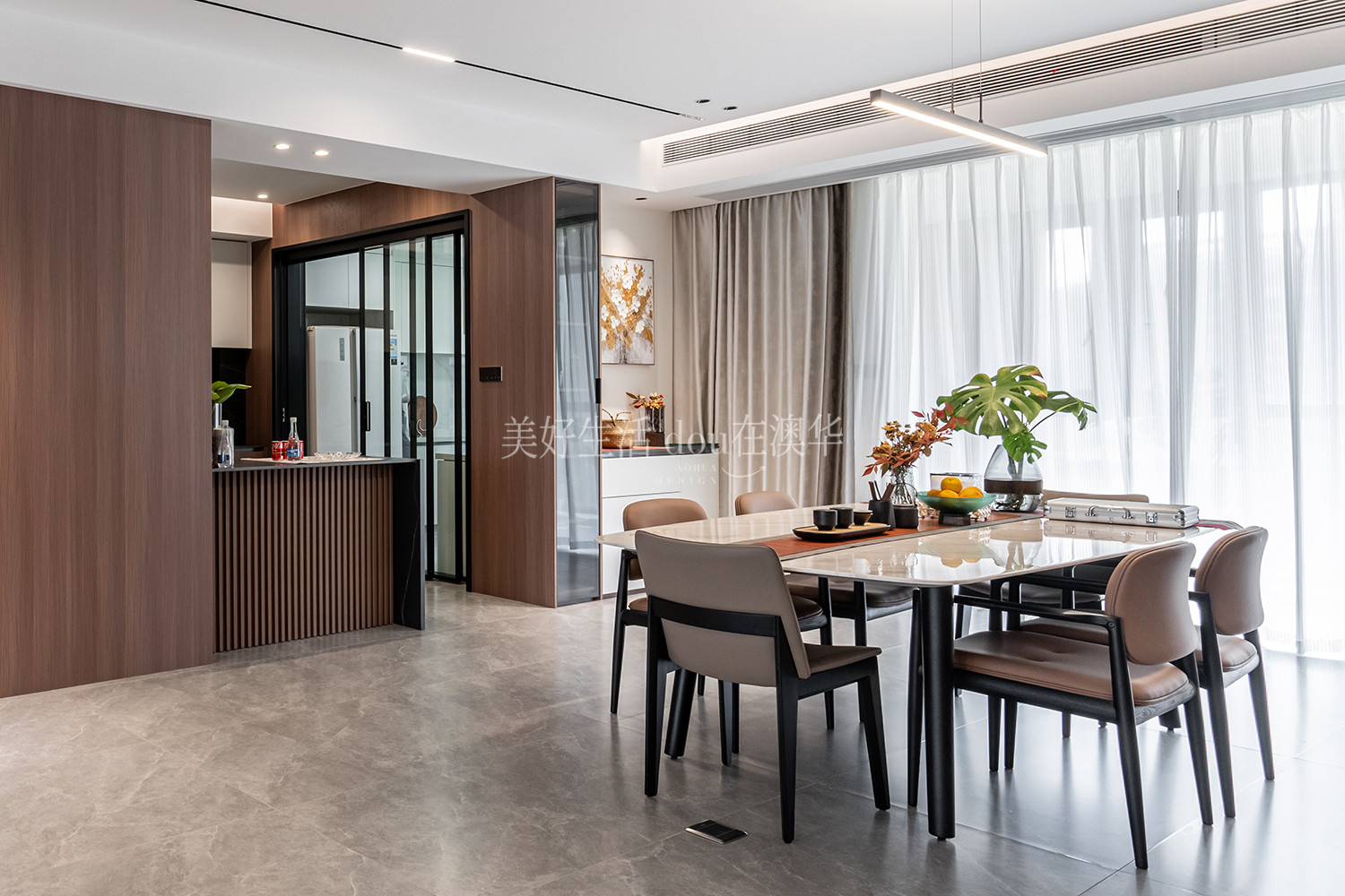 一整排柜子在餐厅采用半开放式设计,收纳不再作为首要考量,精美茶具与特色展品陈列其中,熠熠生辉,渲染出独特的风雅韵味,用餐的氛围愈发高雅别致。