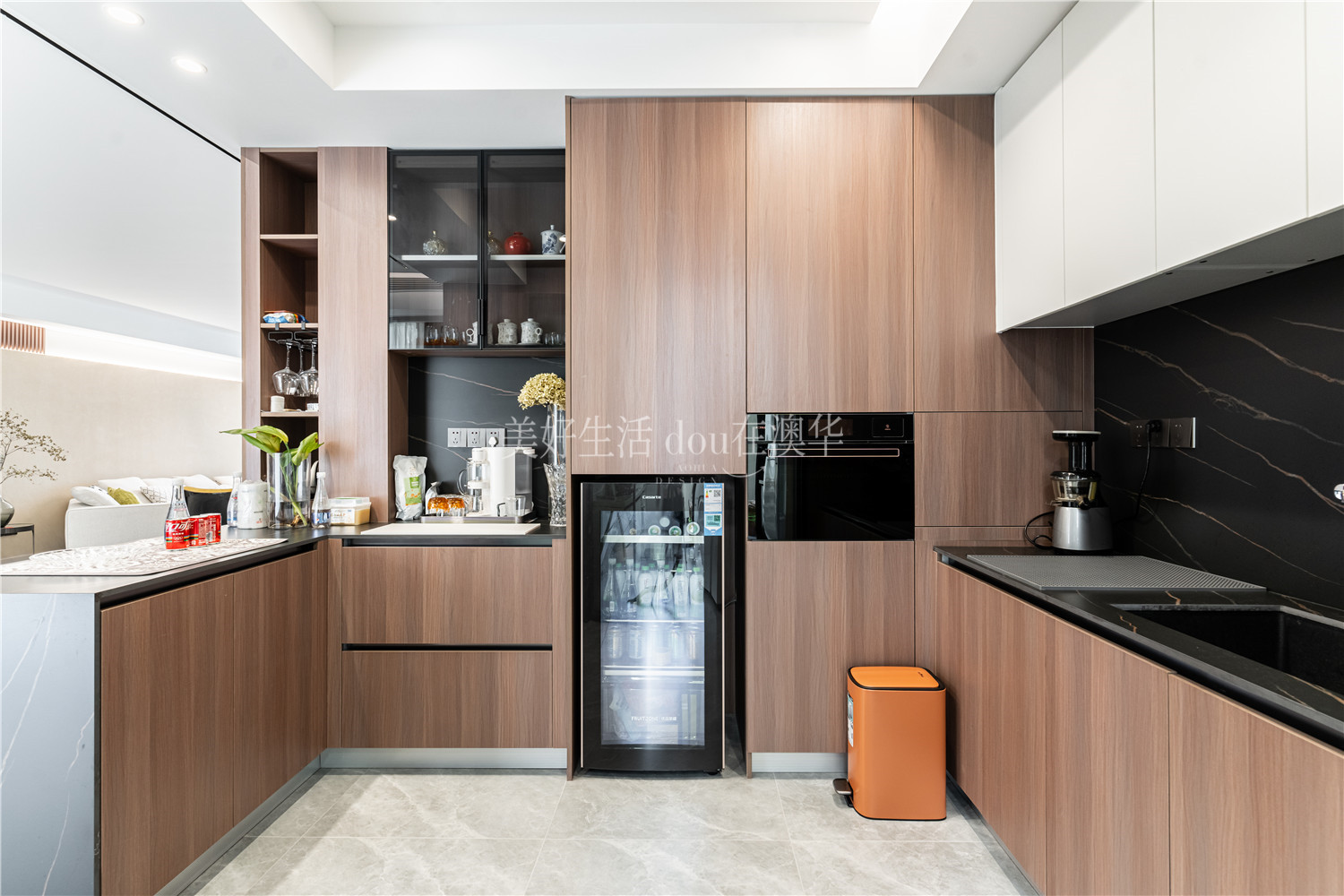 重新梳理后的厨房,功能强大且井然有序。木色作为主导,铺就温馨基调;墨色点缀,突显尊贵品质。U型布局,电器内嵌,多种收纳模块,空间被更科学地使用。