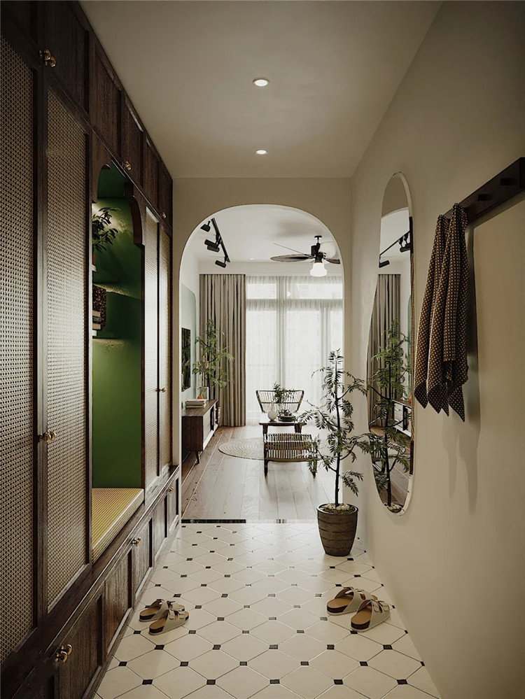 玄关作为家里的入户处,地面瓷砖可与客餐厅保持一致,起到延展视觉的效果。